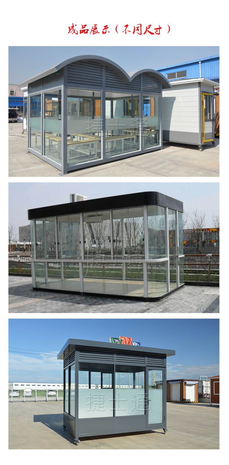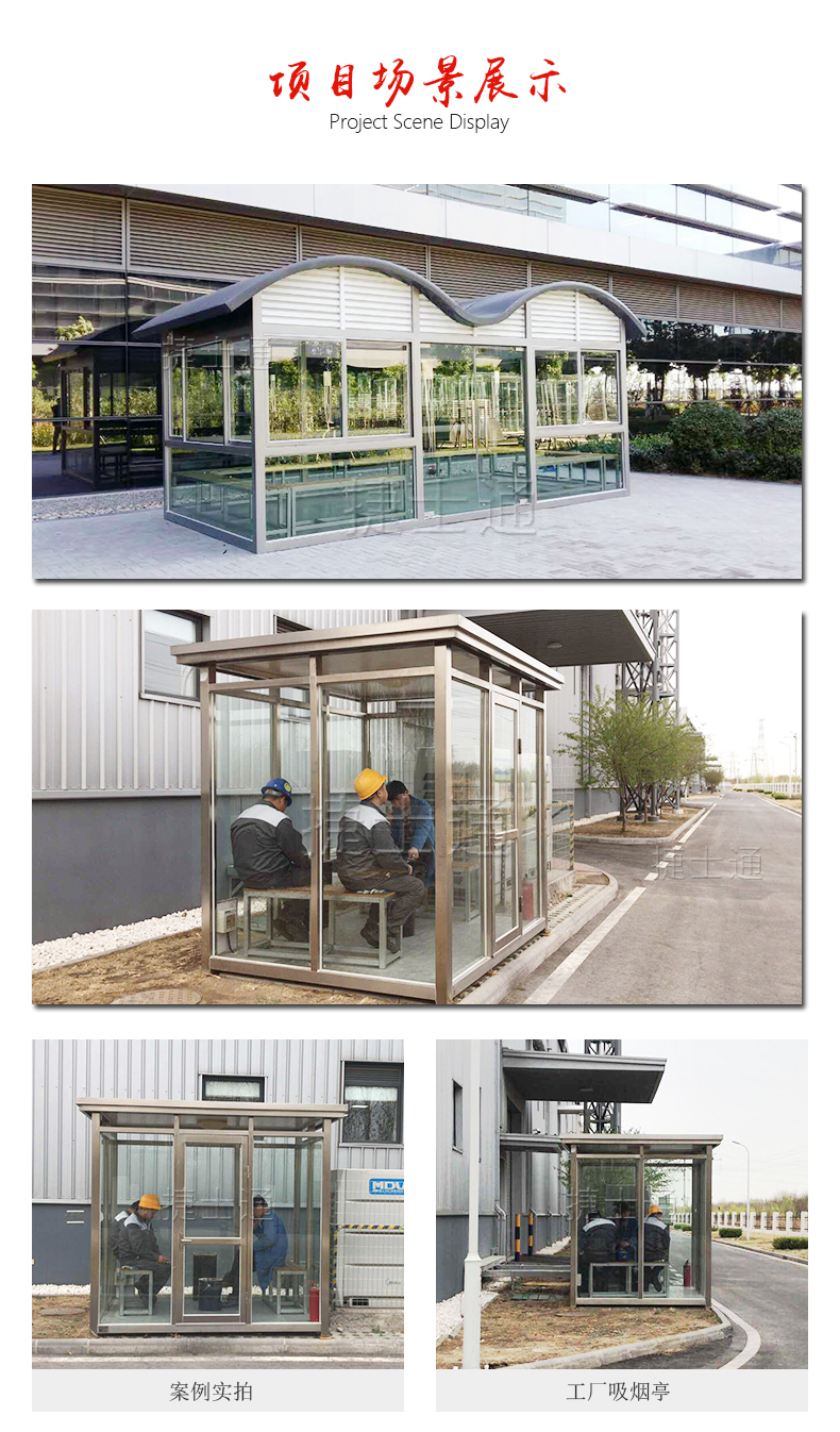 標(biāo)準(zhǔn)配置:屋頂鍍鋅板靜電噴涂,PVC吊頂,墻體玻璃材質(zhì)(鋼化、中空、有色玻璃等可定做),照明燈,漏電保護(hù)器,插座組,開關(guān),長凳,煙灰缸(如需空調(diào),排風(fēng)扇請聯(lián)系客服。咨詢電話:15822882616,公司網(wǎng)址:www.hbacg.com