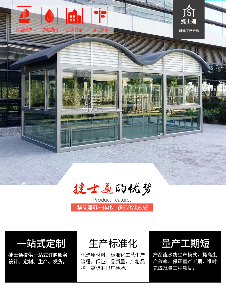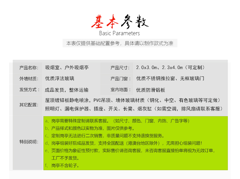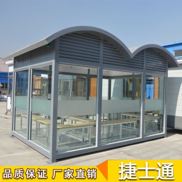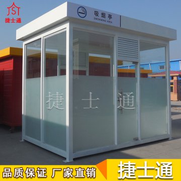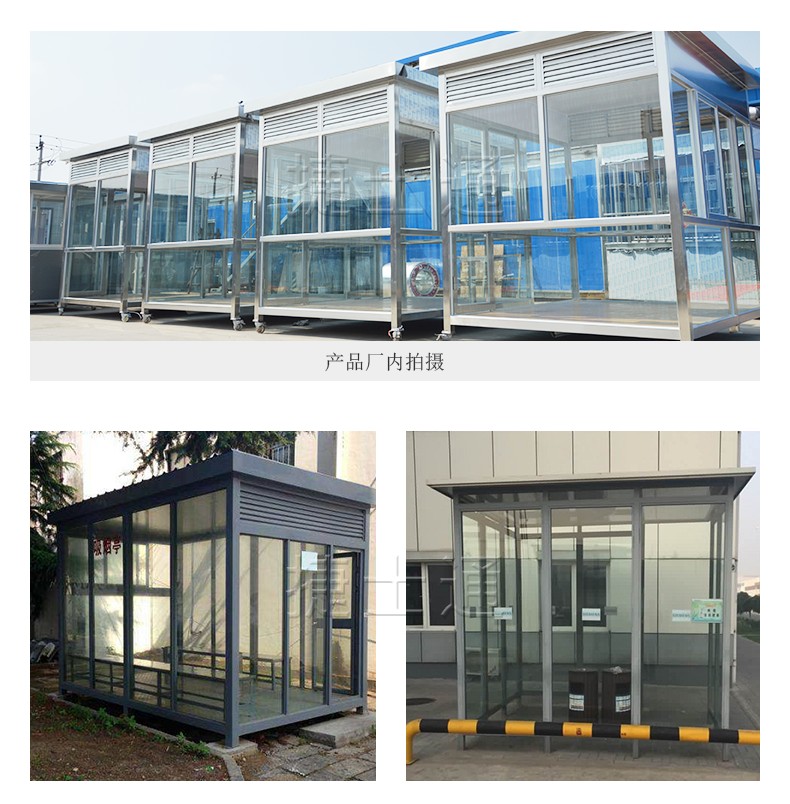 標準配置:屋頂鍍鋅板靜電噴涂,PVC吊頂,墻體玻璃材質(zhì)(鋼化、中空、有色玻璃可定制),電箱、開關(guān)、插座、暗敷電線、照明燈、煙灰缸等??杉优洌嚎照{(diào)等。