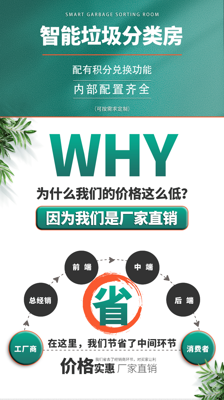 垃圾分類房系列產品外觀整潔大氣,高端時尚,可融入周邊建筑群體,并可為垃圾分類引導員提供休息執(zhí)勤的空間,房屋內部設備配套齊全,可有效解決氣味污染、環(huán)境視覺污染等問題。垃圾分類房的設置可以減少垃圾處理量和處理設備,降低處理成本,減少土地資源的消耗,具有社會、經(jīng)濟、生態(tài)等幾方面的效益,在垃圾分類工作中發(fā)揮了不可替代的作用。我公司致力于垃圾分類房的整體解決研發(fā)設計,擁有強大的研發(fā)團隊、設計團隊、銷售管理團隊以及自動化流水線式的生產車間,致力于開拓全國、服務全國,打造全國先進的垃圾分類房生產廠家。