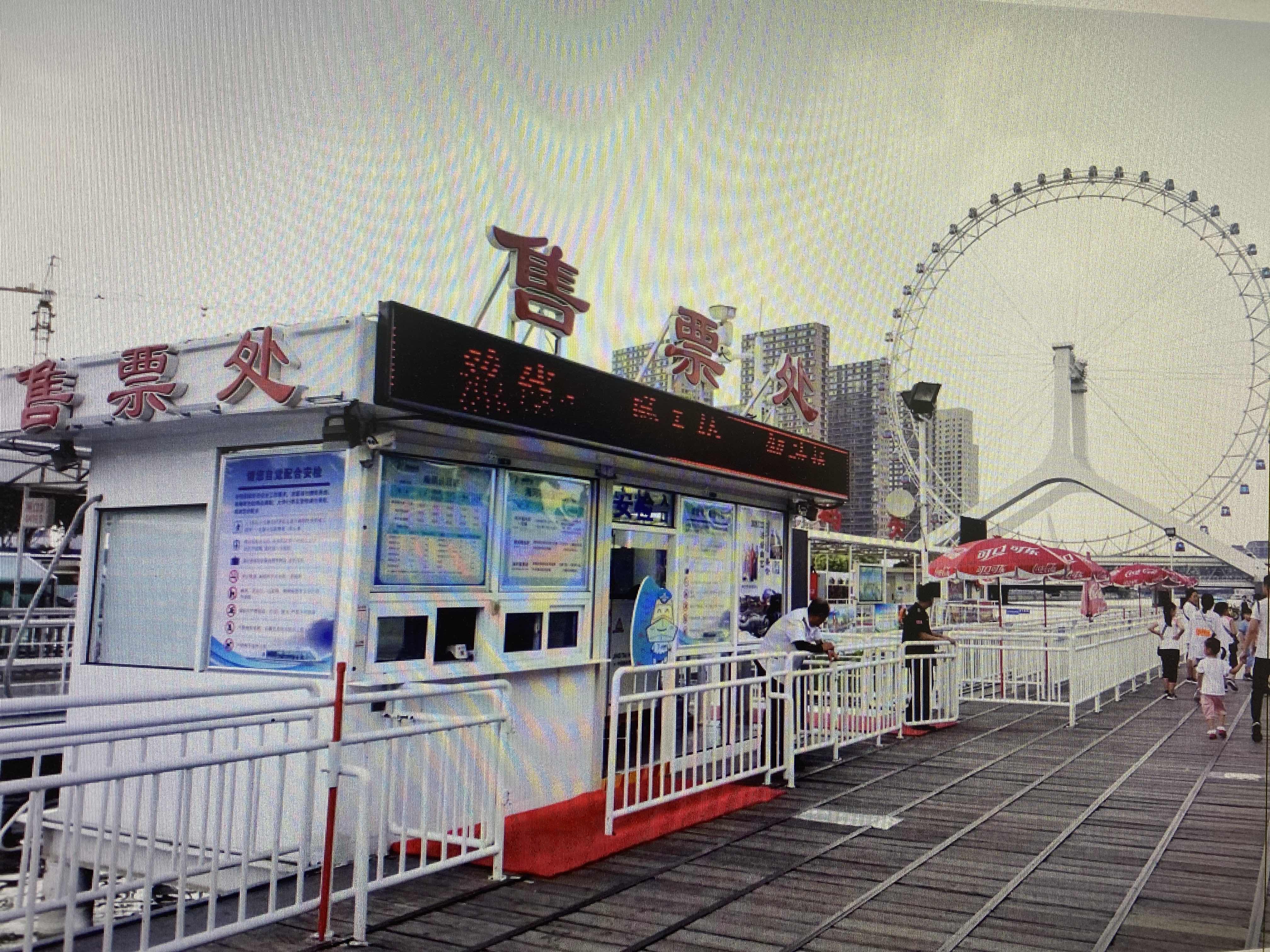 今天主播在線直播天津海河摩天輪下面的游船捷士通售票亭以及戶外移動廁所